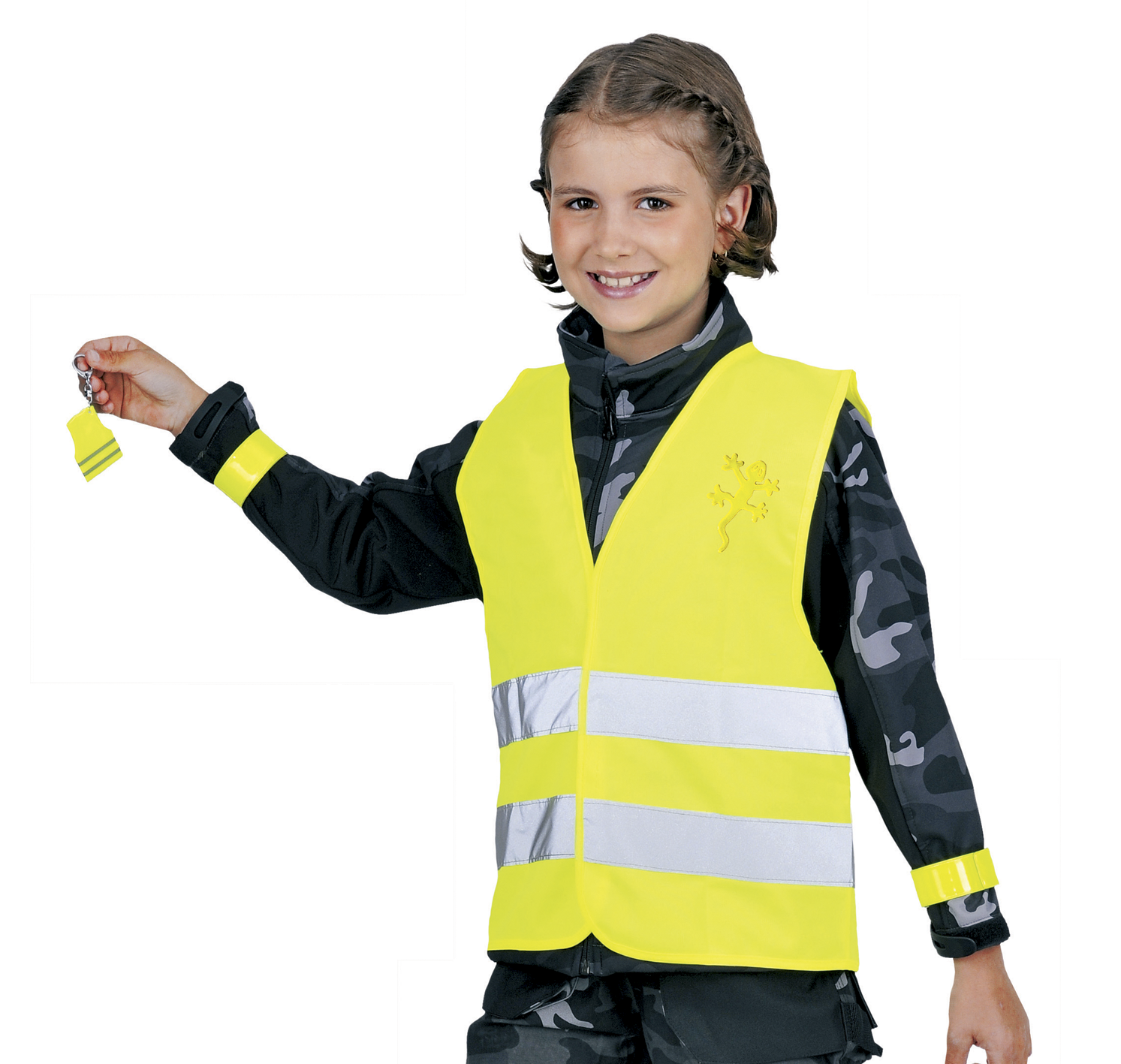 Børne Refleks sæt med børnevest (str. 120-140 cm), 2 stk. slap wrap armbånd, refleks klistermærke og refleks nøglering. (Læs mere)